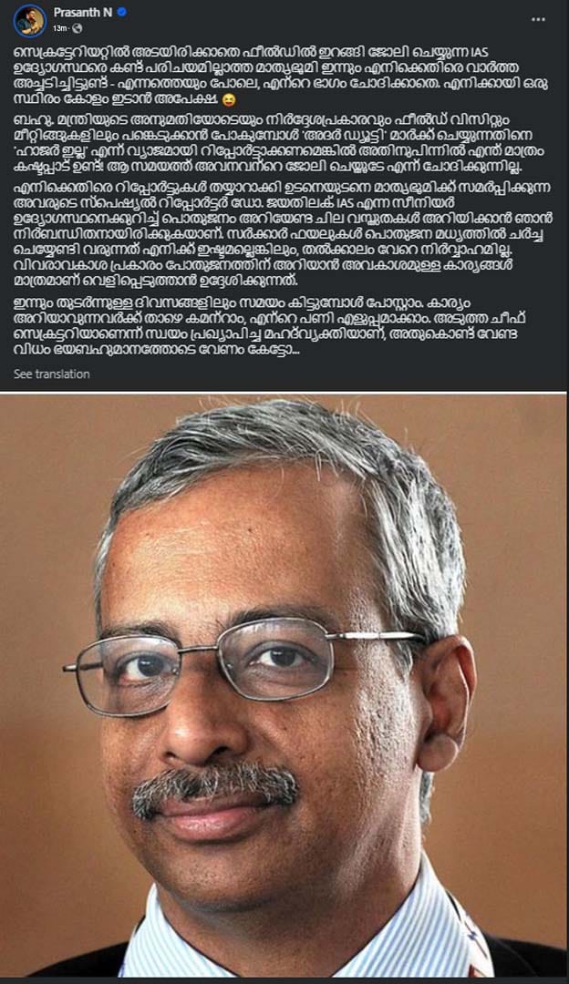ഡോ.ജയതിലകിനെക്കുറിച്ച് പൊതുജനം അറിയേണ്ട ചില കാര്യങ്ങള് വെളിപ്പെടുത്തുമെന്നും പ്രശാന്ത് പറയുന്നു. ‘സര്ക്കാര് ഫയലുകള് പൊതുജന മധ്യത്തില് ചര്ച്ച ചെയ്യേണ്ടി വരുന്നത് എനിക്ക് ഇഷ്ടമല്ലെങ്കിലും, തല്ക്കാലം വേറെ നിര്വ്വാഹമില്ല. വിവരാവകാശ പ്രകാരം പോതുജനത്തിന് അറിയാന് അവകാശമുള്ള കാര്യങ്ങള് മാത്രമാണ് വെളിപ്പെടുത്താന് ഉദ്ദേശിക്കുന്നത്. ഇന്നും തുടര്ന്നുള്ള ദിവസങ്ങളിലും സമയം കിട്ടുമ്പോള് പോസ്റ്റാം. കാര്യം അറിയാവുന്നവര്ക്ക് താഴെ കമന്റാം, എന്റെ പണി എളുപ്പമാക്കാം. അടുത്ത ചീഫ് സെക്രട്ടറിയാണെന്ന് സ്വയം പ്രഖ്യാപിച്ച മഹദ്വ്യക്തിയാണ്, അതുകൊണ്ട് വേണ്ട വിധം ഭയബഹുമാനത്തോടെ വേണം കേട്ടോ…’ -പ്രശാന്ത് കുറിപ്പില് പറയുന്നു.