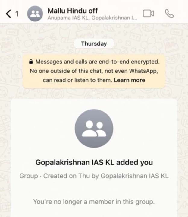 കേരളത്തിലെ ഐ.എ.എസ്. തലപ്പത്ത് കാവിവത്കരണം നടക്കുന്നു എന്ന വ്യാപക പ്രചാരണത്തിനു കാരണമായതാണ് വ്യവസായ-വാണിജ്യ ഡയറക്ടര് കെ.ഗോപാലകൃഷ്ണന് സൃഷ്ടിച്ച മല്ലു ഹിന്ദു ഓഫീസേഴ്സ് എന്ന വാട്ട്സാപ്പ് ഗ്രൂപ്പ്. ഇങ്ങനൊരു ഗ്രൂപ്പ് വന്നപാടെ അത് തിരുവനന്തപുരത്തെ ഒരു വാര്ത്താ ചാനലിലെ പ്രമുഖന് സ്ക്രീന്ഷോട്ട് സഹിതം വിവരം കൈമാറിയത് ഒരു ഐ.എ.എസ്. ഉദ്യോഗസ്ഥനാണ്. മുന്വശവും പിന്വശവും പരിശോധിക്കാതെ ആ മാധ്യമപ്രവര്ത്തകന് അതു പൊട്ടിച്ചപ്പോള് വലിയ വാര്ത്തയും വിവാദവുമായി. ഗോപാലകൃഷ്ണനും അദ്ദേഹത്തോട് അടുപ്പം പുലര്ത്തുന്നവര്ക്കും ആ ചാരനാരാണ് എന്നത് വ്യക്തമായി അറിയാം. ആ ചെയ്തതിനുള്ള മറുപണി ഏതാനും ദിവസങ്ങള്ക്കകം തന്നെ ‘ചാരന്’ അവര് കൊടുക്കുകയും ചെയ്തു.