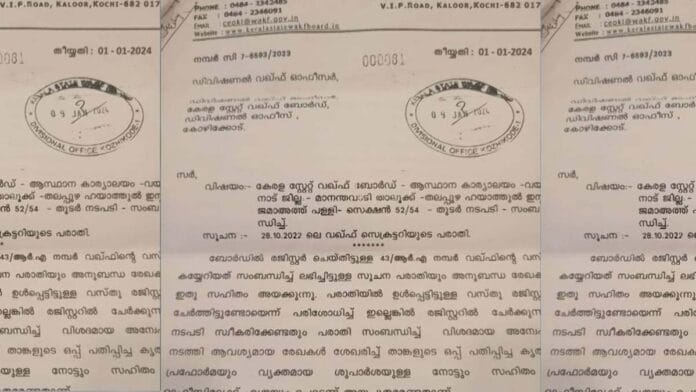 എതിര്പ്പുകളുണ്ടെങ്കില് രേഖകള് ഹാജരാക്കാന് 14-ാം തീയതി വരെ സമയം നല്കിയിട്ടുണ്ട്. 14-ാം തീയതി രേഖകള് ഹാജരാക്കുകയും 19-ാം തീയതി അദാലത്തില് പങ്കെടുക്കുകയും വേണം. ഇതില് പങ്കെടുക്കാന് സാധിച്ചില്ലെങ്കില് ഏകപക്ഷീയമായി വിധി പുറപ്പെടുവിച്ച് വഖഫ് ഭൂമി ഏറ്റെടുക്കുന്ന പ്രഖ്യാപനം വരുമെന്നാണ് നോട്ടീസില് ചൂണ്ടിക്കാട്ടുന്നത്.