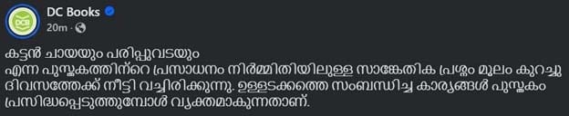 ഇതേത്തുടര്ന്നാണ് പുസ്തകത്തിന്റെ പ്രസാധനം നീട്ടിവെച്ചതായി ഡി.സി. ഫേസ്ബുക്കിലൂടെ അറിയിച്ചത്. ‘കട്ടന് ചായയും പരിപ്പുവടയും എന്ന പുസ്തകത്തിന്റെ പ്രസാധനം നിര്മ്മിതിയിലുള്ള സാങ്കേതിക പ്രശ്നം മൂലം കുറച്ചു ദിവസത്തേക്ക് നീട്ടി വച്ചിരിക്കുന്നു. ഉള്ളടക്കത്തെ സംബന്ധിച്ച കാര്യങ്ങള് പുസ്തകം പ്രസിദ്ധപ്പെടുത്തുമ്പോള് വ്യക്തമാകുന്നതാണ്.’ കുറിപ്പ് പറഞ്ഞു. പുസ്തകം ഇന്ന് മുതല് വിറ്റഴിക്കണമെന്ന് സ്റ്റോറുകള്ക്ക് നല്കിയിരുന്ന നിര്ദേശവും ഡി.സി. ബുക്സ് പിന്വലിച്ചു.