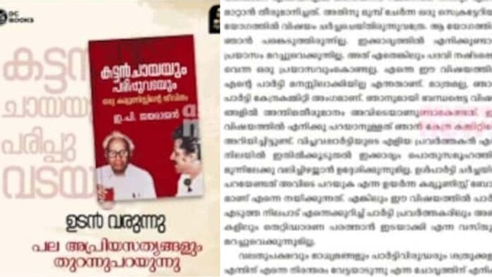 ‘കട്ടന്ചായയും പരിപ്പുവടയും; ഒരു കമ്യൂണിസ്റ്റിന്റെ ജീവിതം’ എന്ന പേരില് ജയരാജന്റെ ആത്മകഥ പുറത്തിറങ്ങുന്നു എന്നാണ് ഡി.സി. അറിയിച്ചത്. പാര്ട്ടി തന്നെ കേള്ക്കാന് തയ്യാറായില്ലെന്നും രണ്ടാം പിണറായി സര്ക്കാര് ദുര്ബലമാണെന്നും ആത്മകഥയില് പറയുന്നതായി വിവരം പുറത്തുവന്നു.