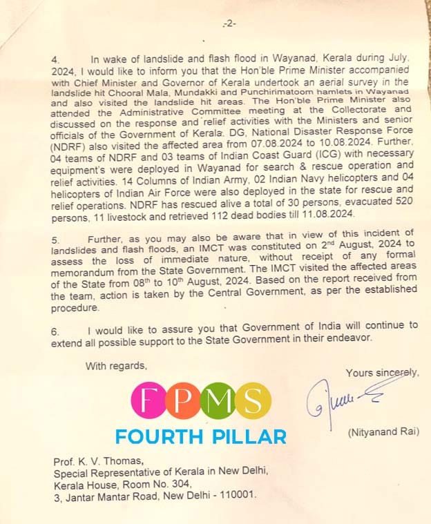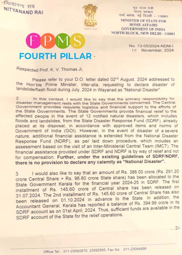 ഇതിനു പുറമെ സംസ്ഥാനത്തിന്റെ ദുരന്ത പ്രതികരണ നിധിയിൽ 2024 ഏപ്രിൽ ഒന്നിലെ കണക്കുപ്രകാരം 394.99 കോടി രൂപയുടെ നീക്കിയിരിപ്പുള്ളതായി അക്കൗണ്ടന്റ് ജനറൽ റിപ്പോർട്ട് ചെയ്തിട്ടുമുണ്ട്. ഈ സാഹചര്യത്തിൽ വയനാട്ടിലെ ദുരിതാശ്വാസ പ്രവർത്തനങ്ങൾക്ക് ആവശ്യമായ പണം കേരളത്തിന്റെ കൈവശമുണ്ടെന്ന് കേന്ദ്ര ആഭ്യന്തര സഹമന്ത്രി ചൂണ്ടിക്കാട്ടി.