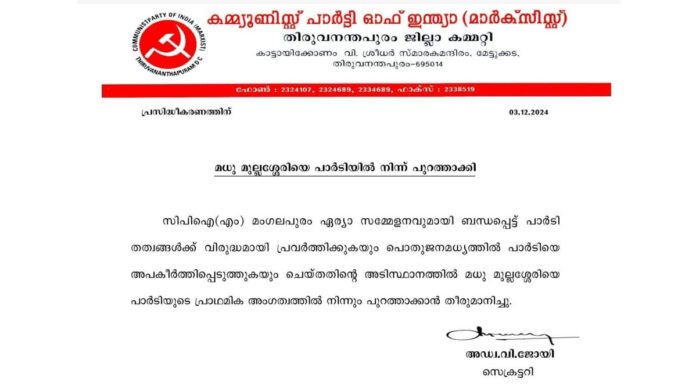 തിരുവനന്തപുരം: സി.പി.എം. മംഗലപുരം ഏരിയാ സമ്മേളനത്തില്നിന്ന് ഇറങ്ങിപ്പോവുകയും ജില്ലാ സെക്രട്ടറിയടക്കമുള്ള നേതാക്കള്ക്കെതിരേ ആരോപണമുന്നയിക്കുകയും ചെയ്ത മുന് ഏരിയാ സെക്രട്ടറി മധു മുല്ലശ്ശേരിയെ പാര്ട്ടിയില് നിന്നു പുറത്താക്കി. പാര്ട്ടി തത്വങ്ങള്ക്ക് വിരുദ്ധമായി പ്രവര്ത്തിക്കുകയും പൊതുജനമധ്യത്തില് പാര്ട്ടിയെ അപകീര്ത്തിപ്പെടുത്തുകയും ചെയ്തതിന്റെ അടിസ്ഥാനത്തില് പ്രാഥമികാംഗത്വത്തില്നിന്ന് പുറത്താക്കുന്നുവെന്ന് ജില്ലാ സെക്രട്ടറി വി.ജോയ് ഇറക്കിയ വാര്ത്താക്കുറിപ്പില് ചൂണ്ടിക്കാട്ടി.