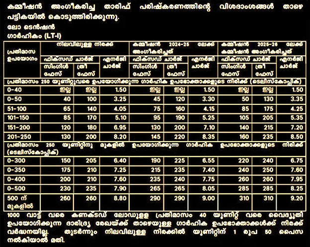 കണക്ടഡ് ലോഡിനെ അടിസ്ഥാനമാക്കി ഗാർഹിത ഉപയോക്താക്കൾക്ക് ഫിക്സഡ് ചാർജ് ഏർപ്പെടുത്തണമെന്ന കെ.എസ്.ഇ.ബി. ആവശ്യം കമ്മിഷൻ തള്ളി. 1000 വാട്ട് കണക്ടഡ് ലോഡും പ്രതിമാസം 40 യൂണിറ്റ് വരെ ഉപഭോഗമുള്ളവരുമായ ദാരിദ്ര്യ രേഖയ്ക്കു താഴെയുള്ള ഗാർഹിക ഉപയോക്താക്കൾക്ക് താരിഫ് വർധന ഇല്ല. അനാഥാലയങ്ങൾ, വൃദ്ധസദനങ്ങൾ തുടങ്ങിയവരുടെ താരിഫ് വർധിപ്പിച്ചിട്ടില്ല. കൃഷി ആവശ്യത്തിനുള്ള വൈദ്യുതിയുടെ നിരക്കിൽ യൂണിറ്റിന് 5 പൈസയുടെ വർധനയാണ് വരുത്തിയത്.