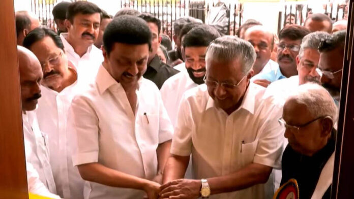 കോട്ടയം: കേരളവും തമിഴ്നാടും തമ്മിൽ ആഴത്തിലുള്ള ബന്ധം നിലനില്ക്കുന്നതിൻ്റെ തെളവായി ഇനി വൈക്കത്ത് തന്തൈപെരിയാർ സ്മാരകവും. വൈക്കത്ത് നവീകരിച്ച തന്തൈപെരിയാർ സ്മാരകവും പെരിയാർ ഗ്രന്ഥശാലയും തമിഴ്നാട് മുഖ്യമന്ത്രി എം.കെ.സ്റ്റാലിനും മുഖ്യമന്ത്രി പിണറായി വിജയനും ചേർന്ന് ഉദ്ഘാടനം ചെയ്തു. പെരിയാർ ഗ്രന്ഥശാലയുടേയും ഉദ്ഘാടനം നടന്നു. കേരള മന്ത്രിമാരായ വി.എൻ.വാസവനും സജി ചെറിയാനും തമിഴ്നാട് മന്ത്രിമാരായ ദുരൈ മുരുകൻ, ഇ.വി.വേലു, എം.പി.സ്വാമിനാഥൻ എന്നിവരും ഉദ്ഘാടന ചടങ്ങിൽ പങ്കെടുത്തു.