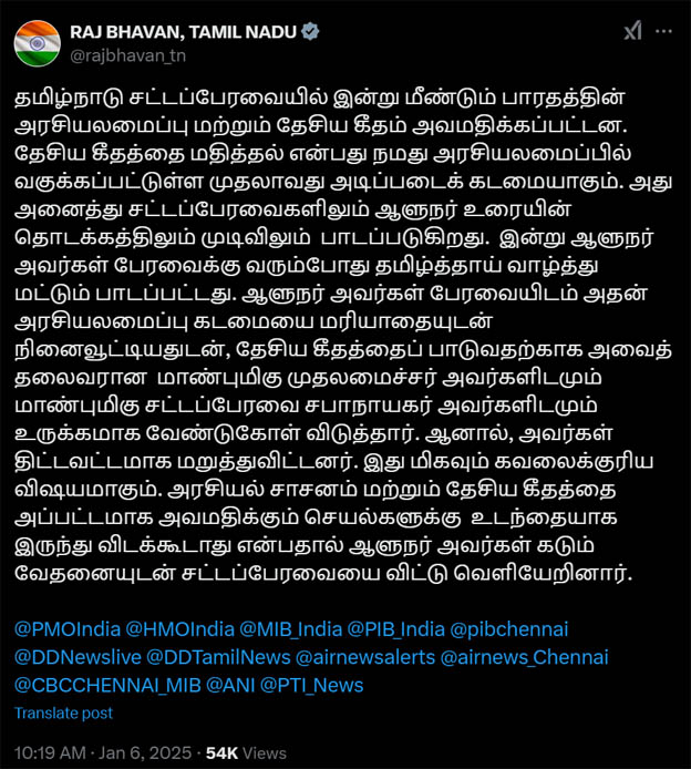 തമിഴ്നാട് നിയമസഭ ഭരണഘടനയെയും ദേശീയ ഗാനത്തെയും ഒരിക്കൽക്കൂടി അപമാനിച്ചുവെന്ന് രാജ്ഭവൻ പുറത്തിറക്കിയ വാർത്താക്കുറിപ്പിൽ ആരോപിച്ചു. ‘ഇന്ന് ഗവർണർ സഭയിൽ എത്തിയപ്പോൾ തമിഴ് തായ് വാഴ്ത്ത് മാത്രമേ ആലപിച്ചിട്ടുള്ളൂ. ഗവർണർ സഭയുടെ ഭരണഘടനാപരമായ കടമയെക്കുറിച്ച് ആദരവോടെ ഓർമ്മിപ്പിക്കുകയും സഭാനേതാവായ ബഹുമാനപ്പെട്ട മുഖ്യമന്ത്രിയോടും ബഹുമാനപ്പെട്ട സ്പീക്കറോടും ദേശീയഗാനം ആലപിക്കാൻ അഭ്യർത്ഥിക്കുകയും ചെയ്തു. എന്നാൽ അവർ അത് നിഷേധിക്കുകയാണുണ്ടായത്. ഗൗരവതരമായ കാര്യമാണിത്.’ -രാജ്ഭവൻ ട്വിറ്ററിൽ കുറിച്ചു.