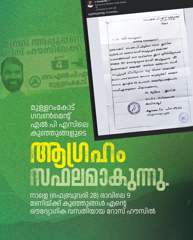 തിരുവനന്തപുരം കല്ലമ്പലം മുള്ളറംകോട് ഗവൺമെന്റ് എൽ.പി.എസിലെ നാലാം ക്ലാസിലെ 83 വിദ്യാർഥികൾ പൊതുവിദ്യാഭ്യാസ മന്ത്രി വി.ശിവൻകുട്ടിക്ക് കത്തെഴുതി. മന്ത്രി അപ്പൂപ്പൻ്റെ ഔദ്യോഗിക വസതിയായ റോസ് ഹൗസ് കാണാൻ അവസരം ഒരുക്കുമോ എന്നതായിരുന്നു കത്തിൽ കുട്ടികളുടെ ചോദ്യം. പിന്നെന്താ ഒരു ദിവസം ഇങ്ങോട്ട് വരൂ എന്ന് സാമൂഹികമാധ്യമങ്ങളിൽ കുറിപ്പ് പങ്കുവെച്ച് മന്ത്രി അപ്പൂപ്പൻ കുട്ടികളെ ക്ഷണിക്കുകയും ചെയ്തു. കത്ത് ലഭിച്ചപ്പോൾ തന്നെ മന്ത്രി കുട്ടികളെ തന്റെ ഔദ്യോഗിക വസതിയിലേക്ക് ക്ഷണിക്കുകയും തീയതിയും സമയവും സ്കൂൾ അധികൃതരെ അറിയിക്കുകയും ചെയ്തു.