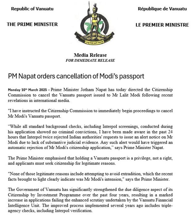 ഐ.പി.എൽ. കോഴ കേസിൽ രാജ്യം വിട്ട ലളിത് മോദിയെ തിരികെ എത്തിക്കാനുള്ള ശ്രമങ്ങൾ എൻഫോഴ്സ്മെൻ്റ് ഡയറക്ട്രേറ്റും (ഇ.ഡി.) സി.ബി.ഐയും തുടരുകയാണ്. അതിനിടെയാണ് ലളിത് മോദി വനുവാറ്റൂ പാസ്പോർട്ട് സ്വീകരിക്കുകയും ഇന്ത്യൻ പാസ്പോർട്ട് തിരികെ സമർപ്പിക്കുന്നതിനുള്ള അപേക്ഷ ലണ്ടനിലെ ഇന്ത്യൻ ഹൈക്കമ്മീഷനിൽ സമർപ്പിക്കുകയും ചെയ്തത്. അന്താരാഷ്ട്ര മാധ്യമങ്ങളിലൂടെ അടുത്തിടെ പുറത്തുവന്ന വെളിപ്പെടുത്തലുകളെ തുടർന്ന് ലളിത് മോദിക്ക് നൽകിയ പാസ്പോർട്ട് റദ്ദാക്കാൻ വനുവാറ്റൂ പ്രധാനമന്ത്രി ജോതം നപത് രാജ്യത്തെ പൗരത്വ കമ്മീഷനോട് ആവശ്യപ്പെടുകയായിരുന്നു.