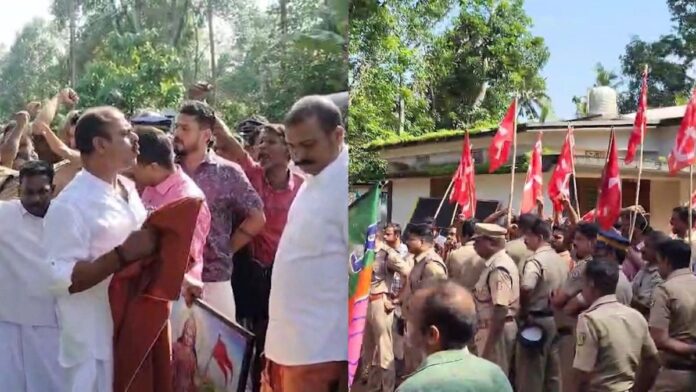 ആലപ്പുഴ: ഭാരതാംബ വിവാദത്തിൽ കൃഷി മന്ത്രി പി.പ്രസാദിനെതിരെ പ്രതിഷേധവുമായി ബി.ജെ.പി. പ്രവർത്തകർ. മന്ത്രിയുടെ വീടിന് മുന്നിൽ ഭാരതാംബയുടെ ചിത്രം സ്ഥാപിച്ച് വിളക്കുകൊളുത്താൻ ബി.ജെ.പി. പ്രവർത്തകർ ശ്രമിച്ചു. എന്നാൽ സി.പി.ഐ. പ്രവർത്തകർ സംഘടിച്ചെത്തിയതോടെ പ്രദേശത്ത് സംഘർഷ സാഹചര്യം രൂപപ്പെടുകയായിരുന്നു. പ്രദേശത്ത് വൻ പൊലീസ് സന്നാഹം ഏർപ്പെടുത്തിയിരിക്കുകയാണ്.